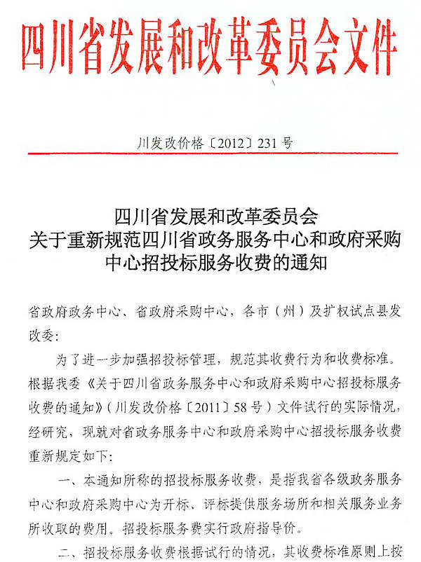 四川省发展和改革委员会关于重新规范四川省政务服务中心和政府采购中心招投标服务收费的通知